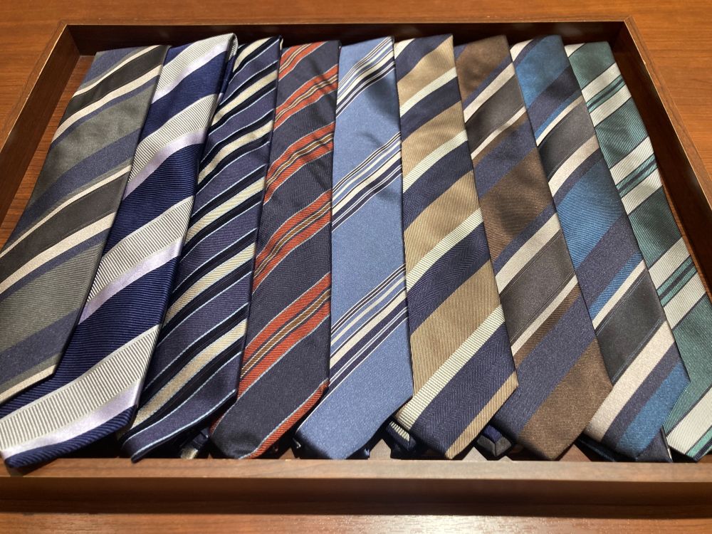 斜めの線が特徴で、ネクタイの定番です。シャープな印象を与え、皆様にも馴染みのある柄ではないでしょうか?
