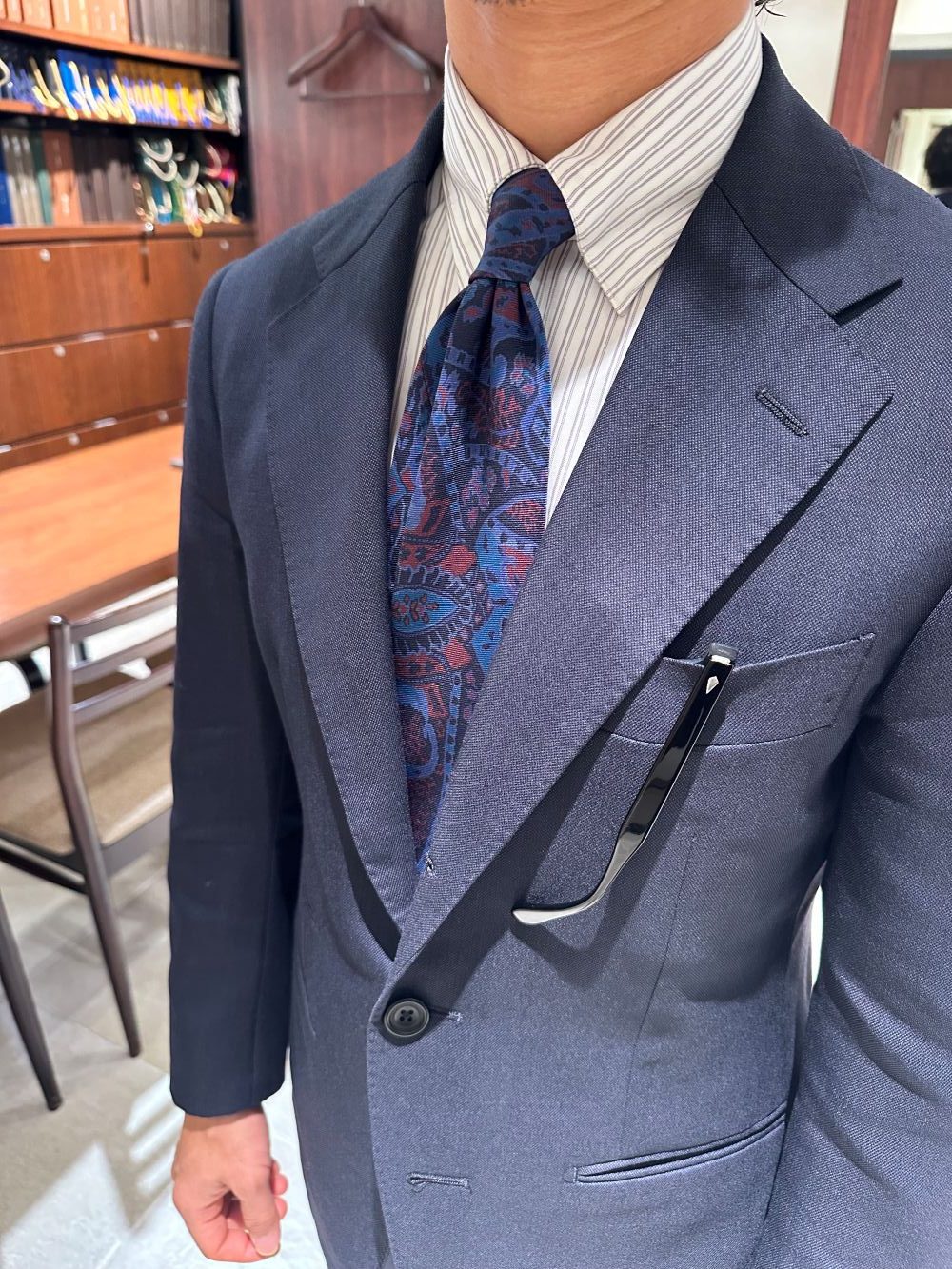 さらに、最近はポケットチーフを挿す気分ではないらしく、眼鏡を入れているのも金井流。