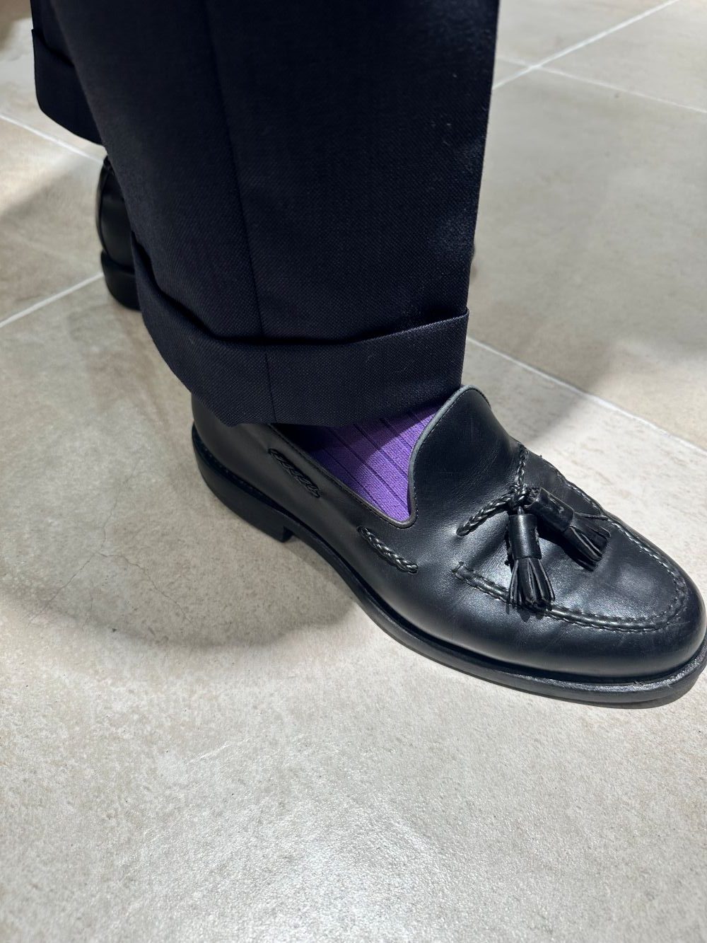 タッセルローファーにパープルのソックスを合わせました。