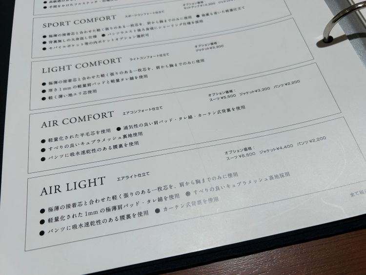 この芯地を麻布テーラーでは涼しさ軽さなどによってお選びすることができます。