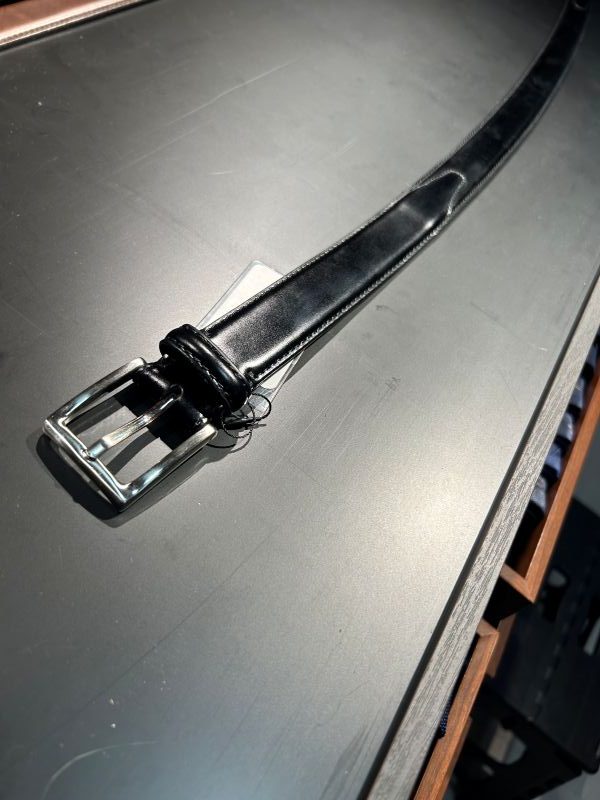 国内屈指のタンナーである新喜皮革と麻布テーラーのコラボによって実現したコードバンのカーブベルトです。多種多様な革の中でも最高級と評されるコードバンのベルトは、革表面のキメの細かさが特徴で、一目で高級感が伝わります。