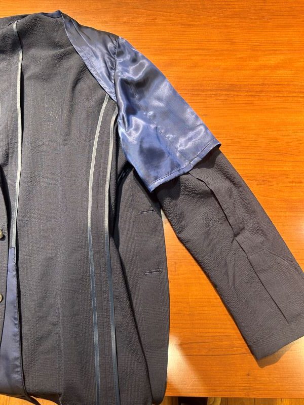 ・毛芯、パット、背裏、袖裏を省いた驚くほどの軽量仕立て。袖裏を省いているのが大きな特徴で、夏場は半袖カットソーやニットと合わせることが多くなることを考慮して、肩から二の腕までの長さにしております。