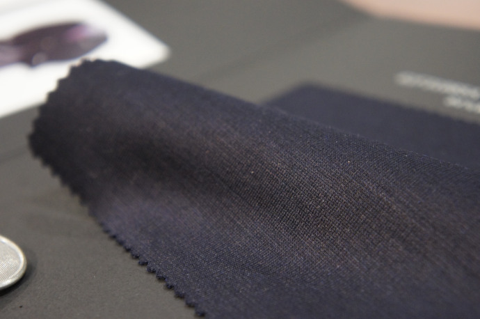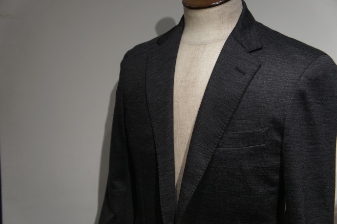 まず、生地はロロピアーナ社のジャージーです。美しい光沢にニュージーランド産メリノウールの滑らかな肌触りが魅力的です。ナイロンとポリウレタンが混ぜられています。ナイロンは丈夫な素材、ポリウレタンは伸縮素材です。ジャージーはポンチ素材と呼ばれる厚手の生地です。生地を触ってみても、しっかりしているのが、わかります。美しく、丈夫、伸縮性は抜群のさすがロロピアーナ社って感じです。