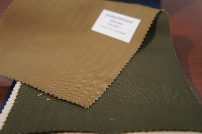 オーガニックコットン100%使用しています。肉薄でありながらしっかりとした目付でハリコシがある素材で、あえて畝の浅いヘリンボーンにすることでパンツとしてコーディネートしやすい目風に仕上げています。