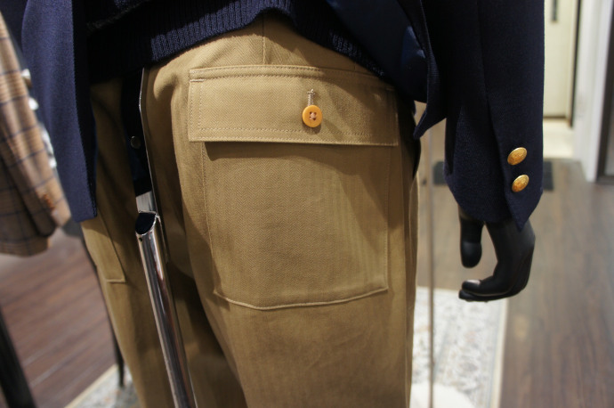 ヒップポケットは、パッチ&フラップ型です。上着を脱いだ時のカジュアル感が良い感じです。