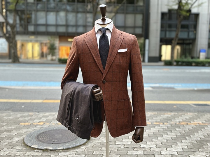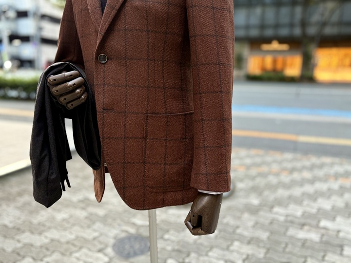 仕立てや布生地の色柄、それが形になった際に更に引き込まれる圧倒的な存在感。良いジャケットの定義は様々ですがおおよそ上述した想いが全て重なった時ではなかろうかと思う。僕はこのロロピアーナの生地に一目ぼれしました。中々お目にかかる事のないこの絶妙なテラコッタカラーが気持ちをぐっと引き寄せたのです。僅か2%のシルクを配合しただけで、柔らかさと品のある光沢が生まれます。流石はロロピアーナたる所以を堂々と見せつけられました。