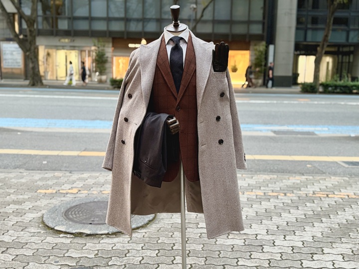 このコートもサンプルを見た際にビビッと電流が走りました。自然で優しいトープカラーに逞しいワイドピッチのヘリンボン柄。形は頂点とも言えるダブルチェスターフィールドコート。注文服だからこそ出会える非常に価値のある一着です。こちらの生地はNOVARA=ノヴァラと言います。あのゼニアグループの仲間です。特にシルクの生産は高く評価されていて、少し肉厚な生地感ながらもタッチはフワッと柔らかくて抜群に着心地が良い。正に僕が理想とする良いコートです。