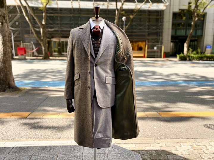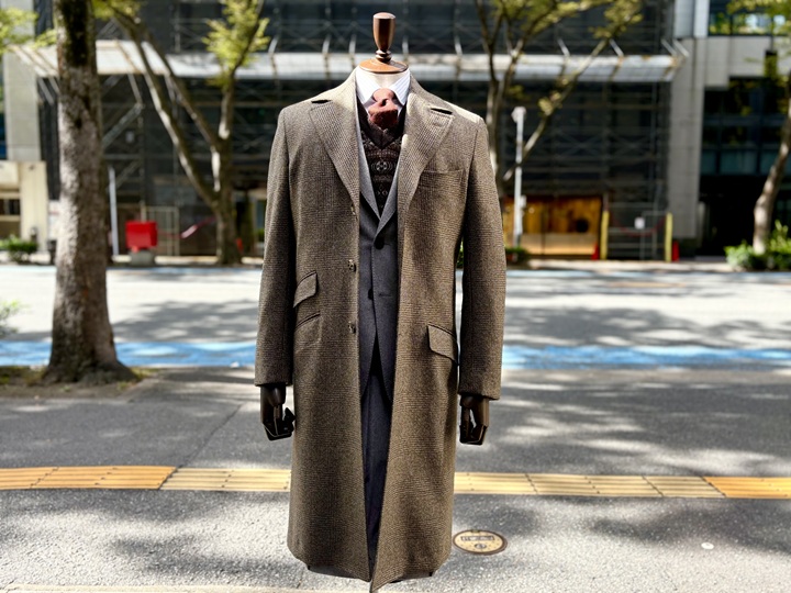 珍しいブラウンのアルスターコート※こちらの生地は完売でございます。ご来店の際は似寄りの生地をご紹介させていただきます。何卒ご了承くださいませ。