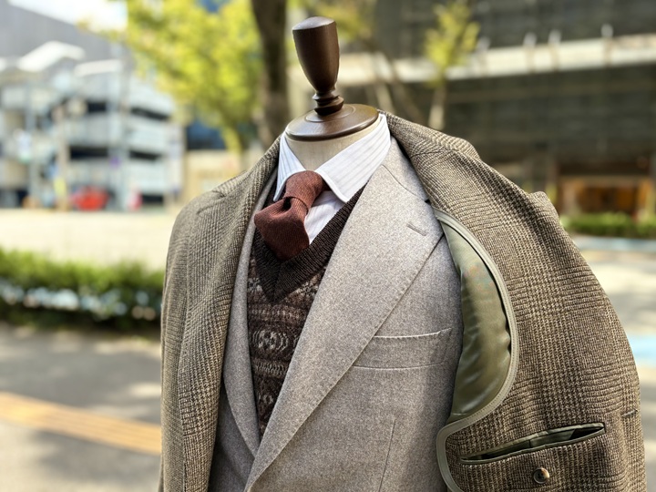 色使いの感覚は人それぞれです。(身内ですが)脇山店長や松尾さんのスタイリングを見ていると、なるほどっ、となります。スーツを着ていてもネクタイを巻いていても色も柄も異なる。世の中には様々なスタイリングが存在します。いやはや紳士服とは楽しくも常に勉強との表裏一体でございます。