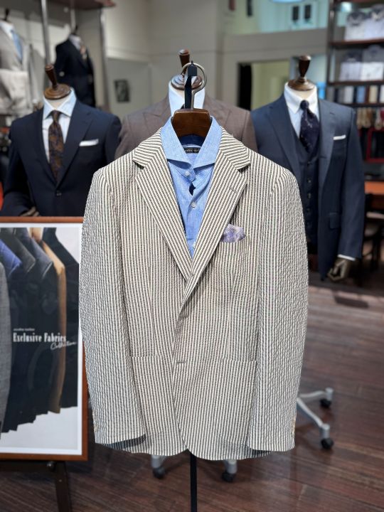 個人的にはシアサッカー×リネンの組み合わせが一番しっくりきます。肌離れも良く、どちらも軽い素材なので、日本の猛暑でも快適にお過ごしいただけると思います。