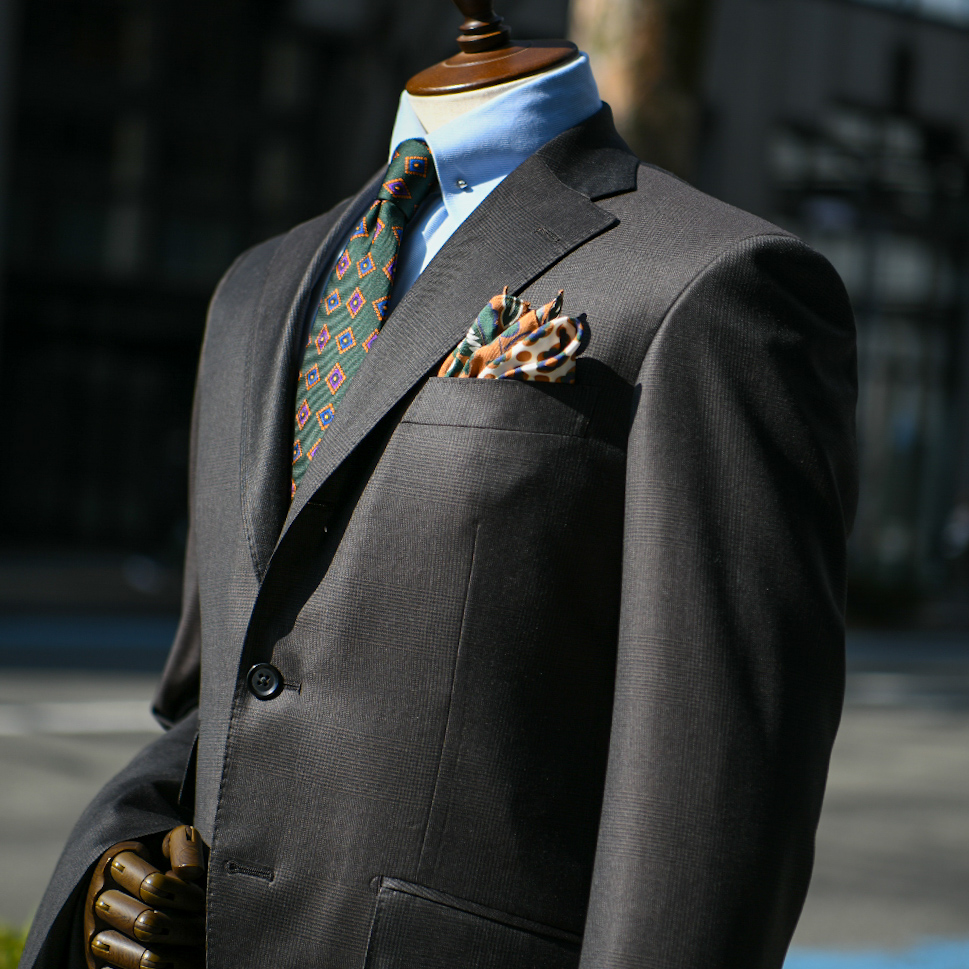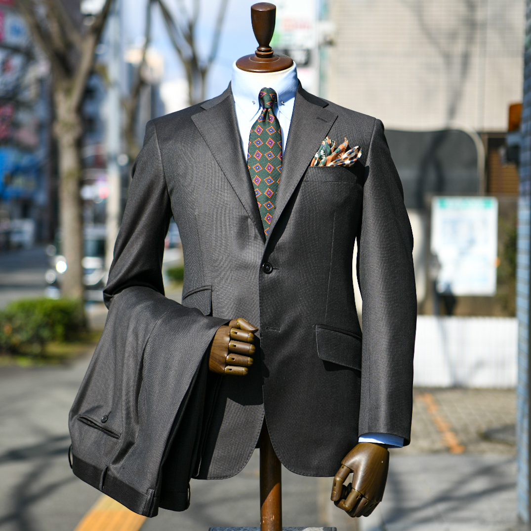 副店長の中本による先日のブログに引き続き、ダークグレーのベースカラーへニュアンスで緯糸にカラーを足したモダンな雰囲気のブラウンスーツです。