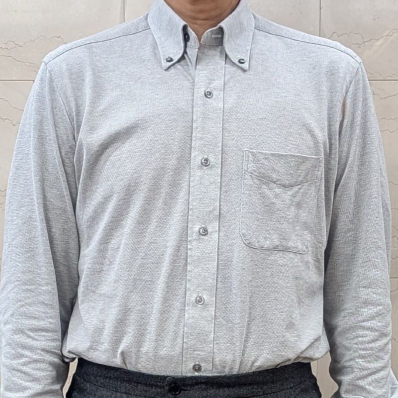 杢調のグレーの鹿の子編みで、襟型はボタンダウンです。