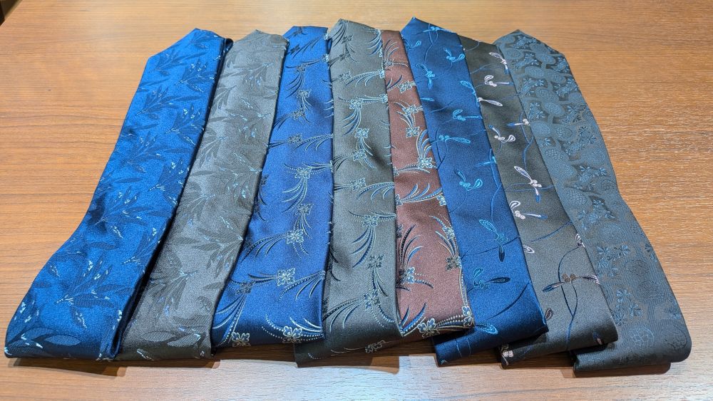いずれも発色が良く、ヴィンテージ感のある柄が胸元を華やかに彩ります。