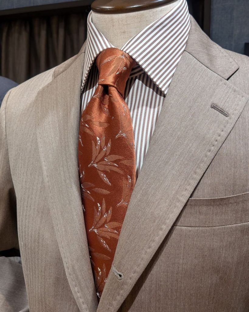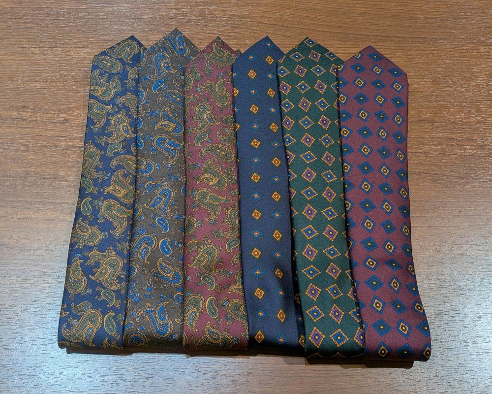 イタリアンファブリックを使用したアーカイブコレクションや英国の名門テキスタイルメーカーのシルクプリント生地のタイが入荷しています。