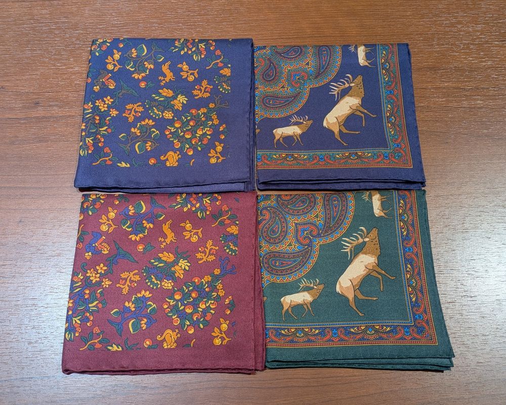 英国のシルクプリント生地を縫製まで英国にこだわった、made in Englandのポケットチーフです。