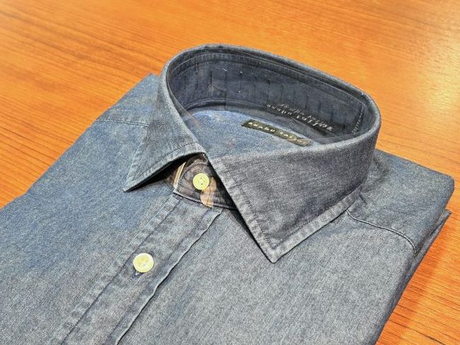 麻布テーラーのデニムシャツは表情が変わる加工が2つあります。