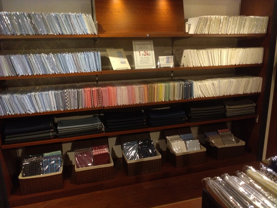店内の袋詰めの生地を2枚で1セットつまりシャツ2枚で¥19,800~オーダーシャツが作成出来ます。