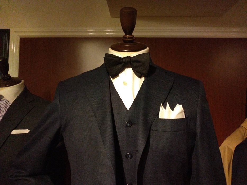このように着こなし方次第でビジネス用にもフォーマルな用途にも着用出来る、まさにシーンレスなスーツをオーダーする事が出来ます。
