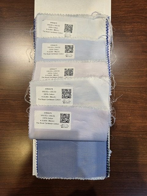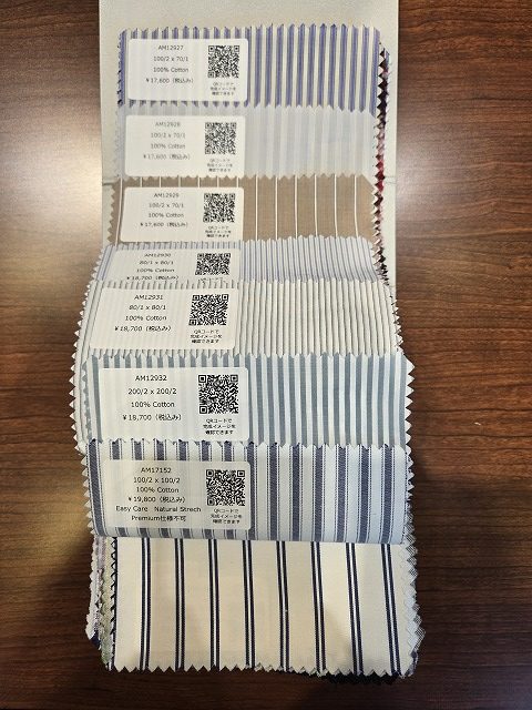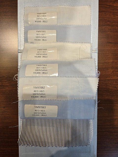 定番の白・ブルーはもちろん、ストライプやチェック柄、常時約300種類以上の生地を取り揃えております。