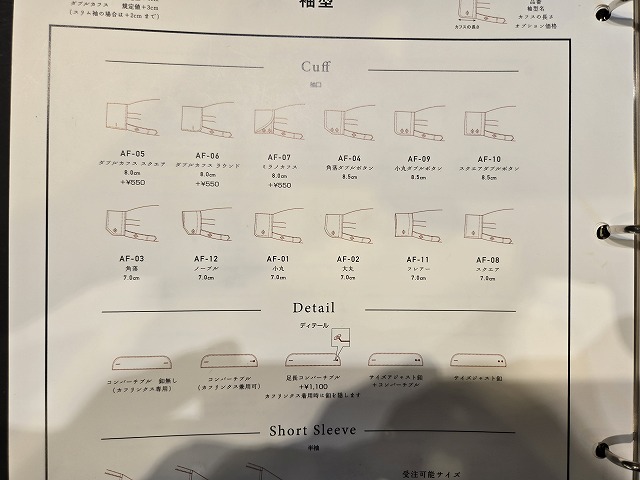 ・カフス:スタイリッシュな角落ち、エレガントなラウンドなど。