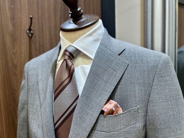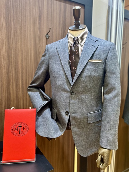 春夏は薄い生地のスーツを着がちですが、このしっかりとした重量感のあるスーツでは威厳さも損ないません。英国好きのお客様には一度は試していただきたい生地となっております。
