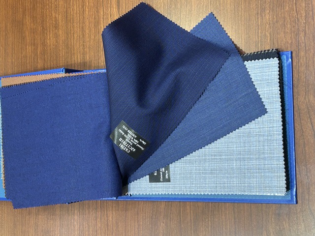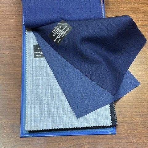 まずはワールドトラベラーシリーズです。こちらは国産のウール100%生地で、220gとかなり軽量の生地となっております。色の展開は紺・ブルーグレー・グレーの三色となっております。色の混じり方が繊細で夏らしいさわやかな仕上がりになります。そして何よりナチュラルストレッチが入る事で、強い防シワ性を保てるのがこの生地の特徴になります。(¥65000~税抜)
