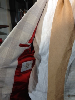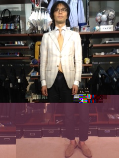コットンシルクのジャケットにコットンリネンのシャツ+リネン100%のタイでスラックスはコットン100%です。