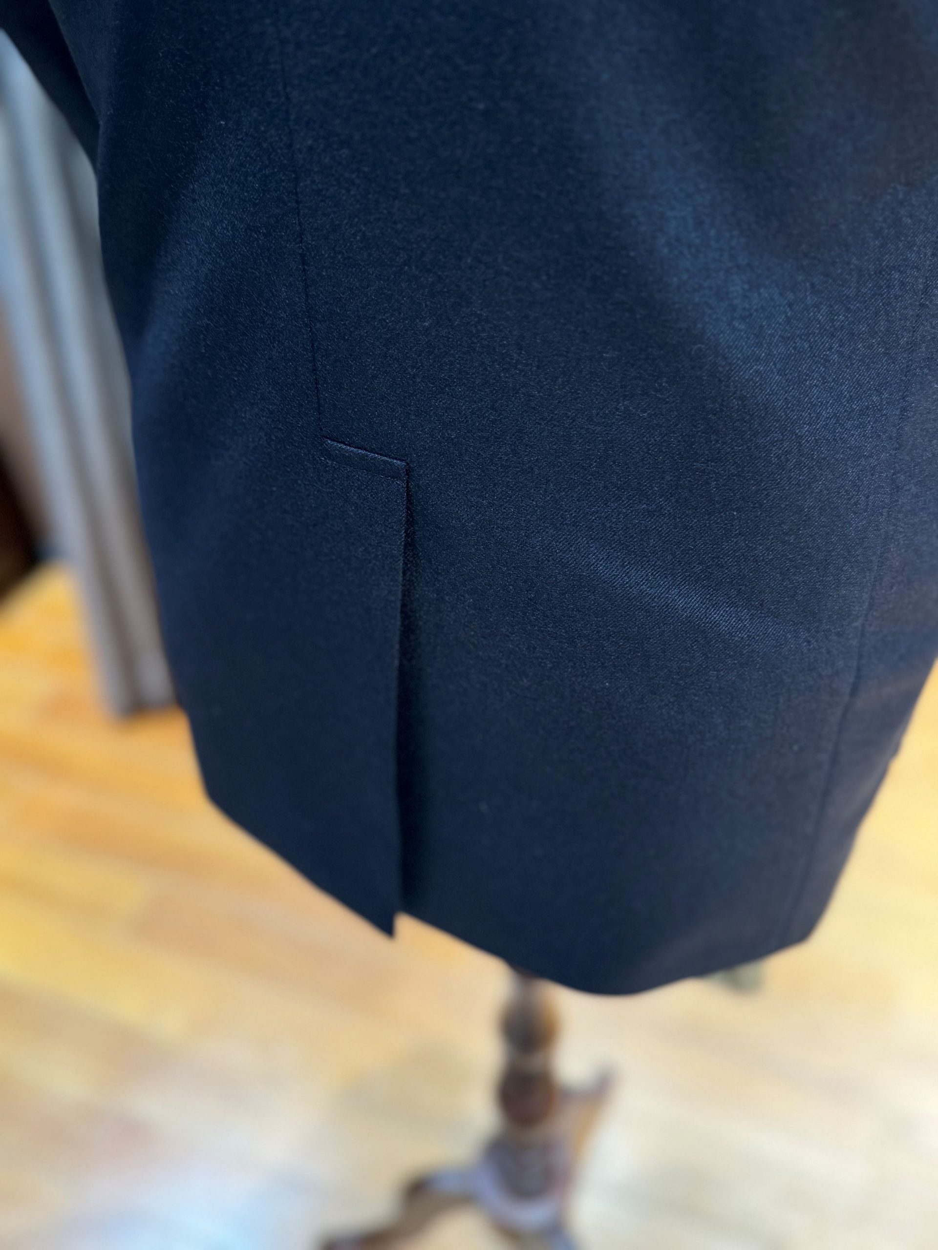 裾仕上げは強度の高めたフックベント。後ろ姿も非常にアイコニックです。
