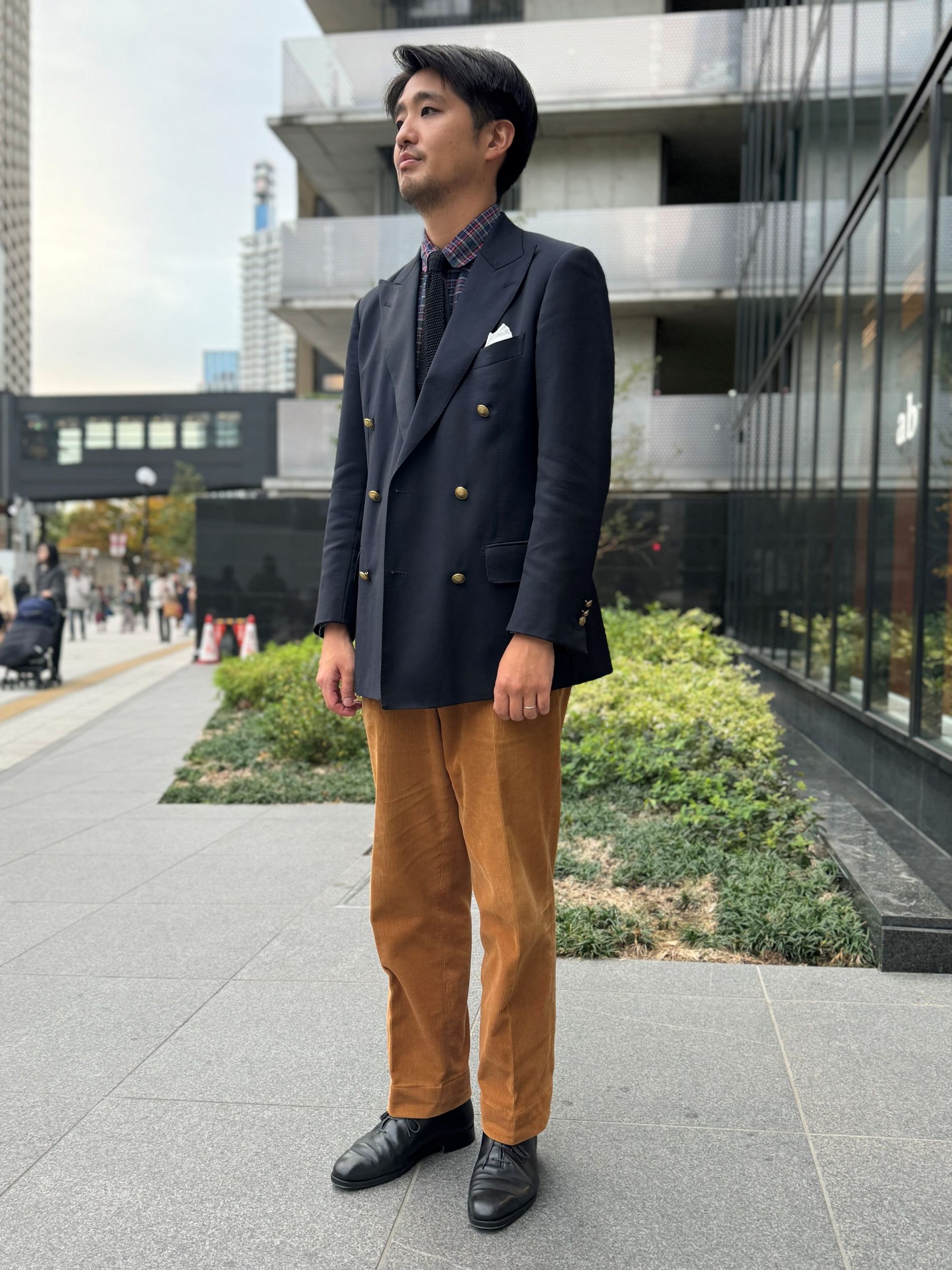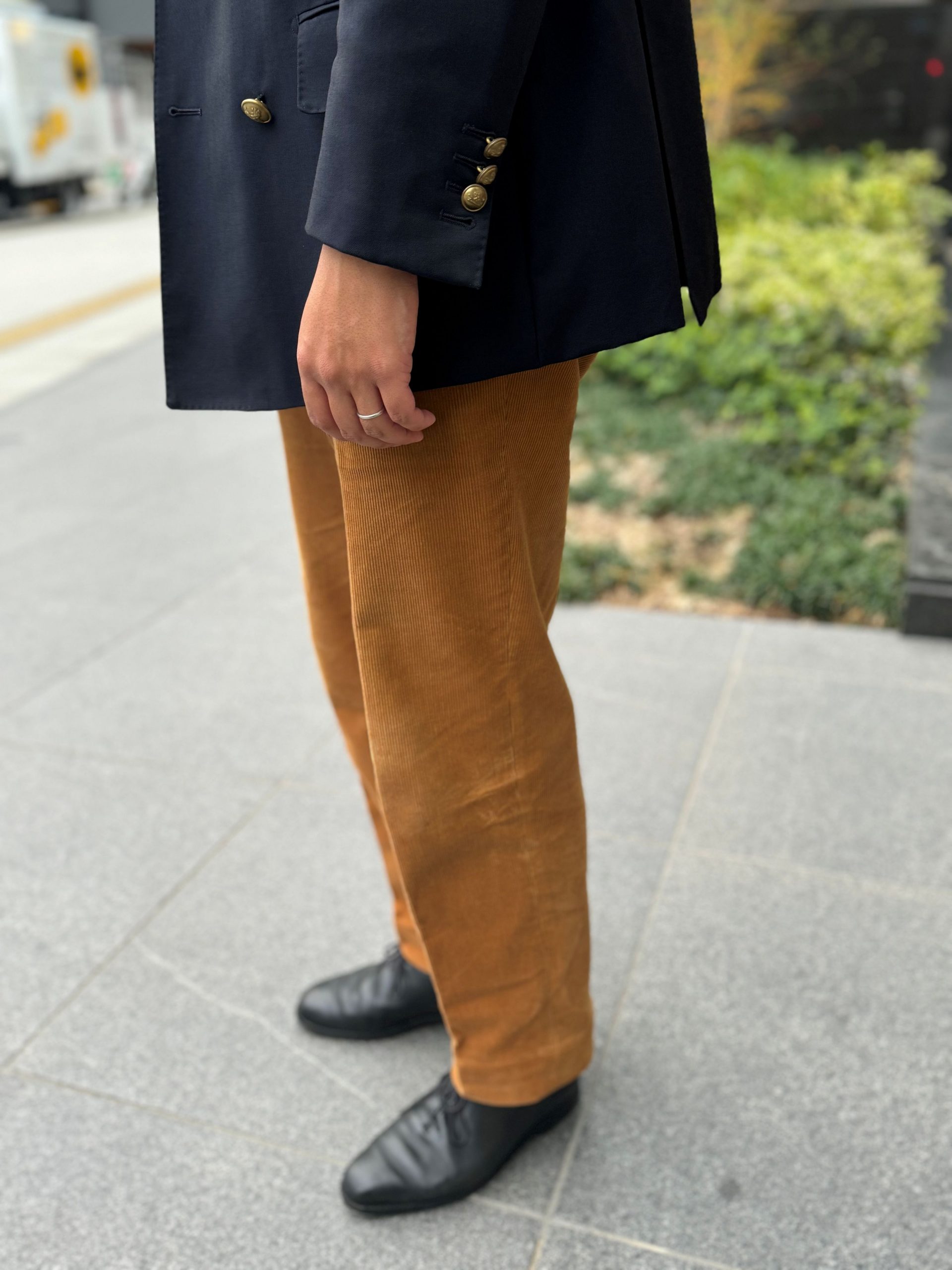 スラックスはブラウンのコーデュロイでカジュアルに寄せつつ、