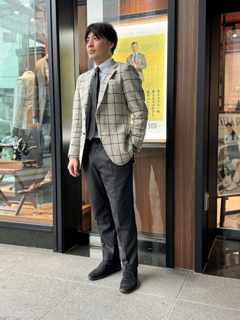 ウールタイとスエードのチャッカブーツを合わせ、温もりのある冬の装いです。