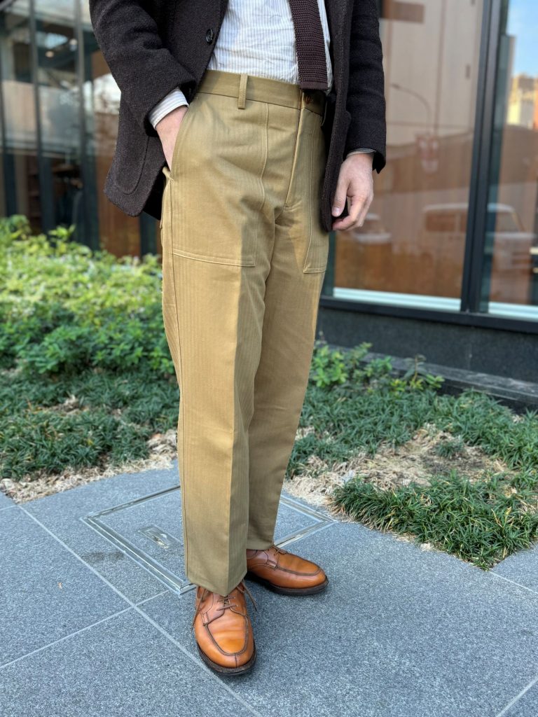 素材は40年代ベイカーパンツに用いられていたようなコットンヘリンボーン以外にも、