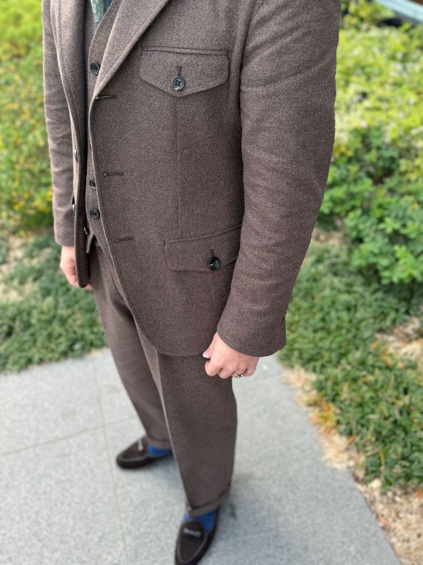 ツイードライクなコットン生地でスリーピースを仕立てました。