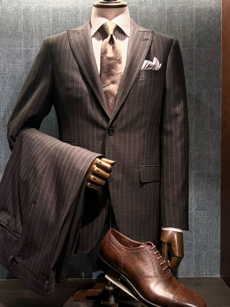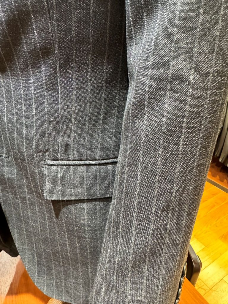サンプルのスーツはクラシックなチャコールのペンシルストライプ。