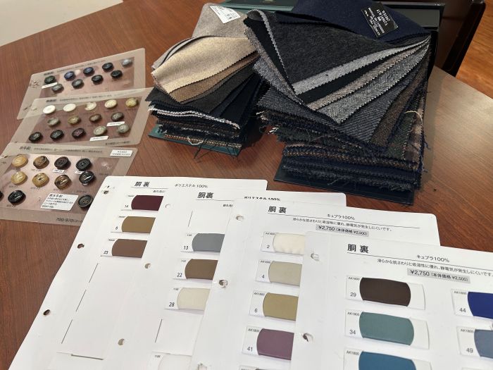 仕様、付属のボタン、裏地をお選びいただく流れです。