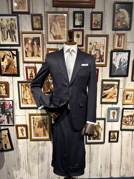上質な国産生地で仕立てたネイビースーツのサンプルです。