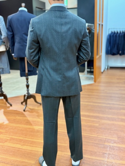 目付270gとオールシーズン着用が可能で、SUPER130’sと上品な光沢感がありながらハリコシも感じられる生地になっています。NAPOLIシリーズ全29種の中から、カーキのグレンチェックの生地を選んでいただきました。 デザインや釦、裏地選びまでこだわりクラシックな雰囲気が漂う素敵な1着が完成しました。