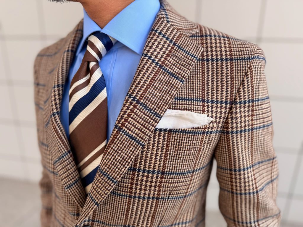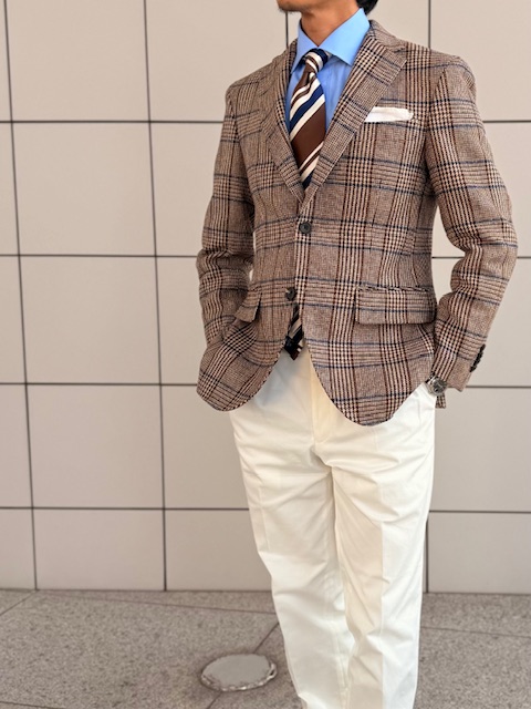 コーディネートはブラウンとブルーでシャツやタイを合わせ、ポケットチーフにリンクさせた白パンツでクリーンなコントラストを効かせ上半身の色味を際立たせています。