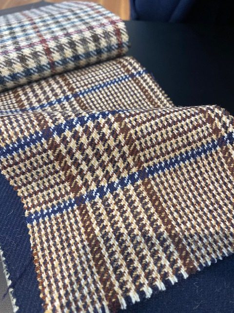 柄はブラウンにブルーチェックです。500g/mのしっかりした目付でありながらゴワつきはなく、エステートツィードと呼ばれる自然に調和した英国的な配色がとても上品です。