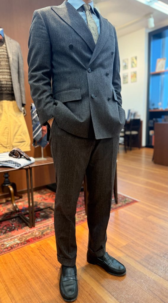 ツイード生地を使用したダブルスーツ。