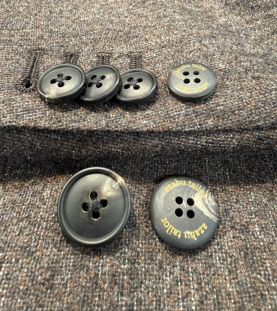ボタンは麻布テーラー刻印入りの水牛ボタンを採用。