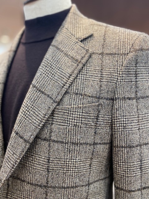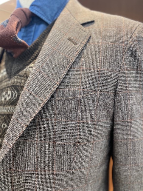 イタリア生地といえばメジャーなカノニコですが、ウール、シルク、リネンの三者混の生地です。サキソニーという柔らかく、しなやかで軽さのあるウール地です。冬の定番生地フランネルほど起毛感がないので上品な艶感があります。ブラウンにオレンジのペーンが温かく優しい柔らかい雰囲気を醸し出してくれています。