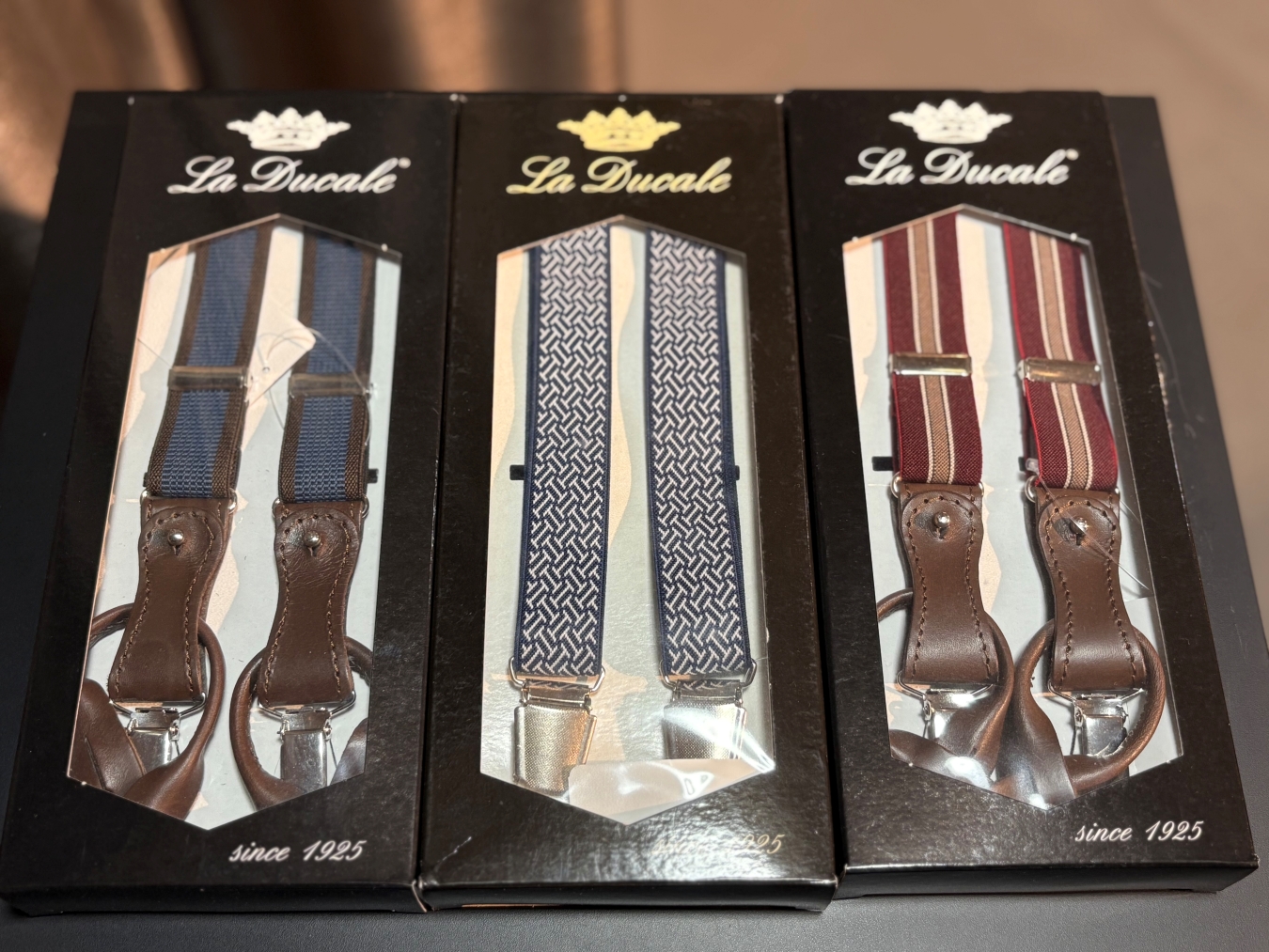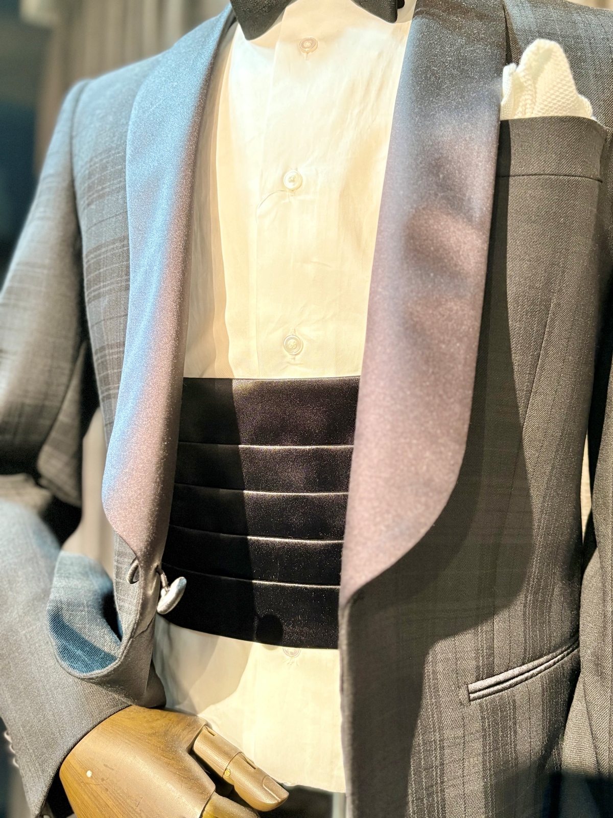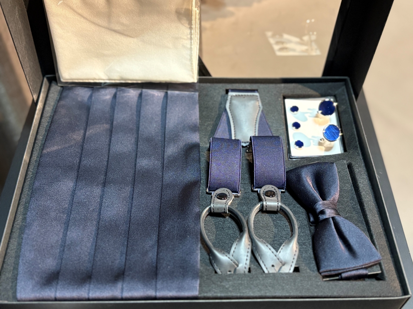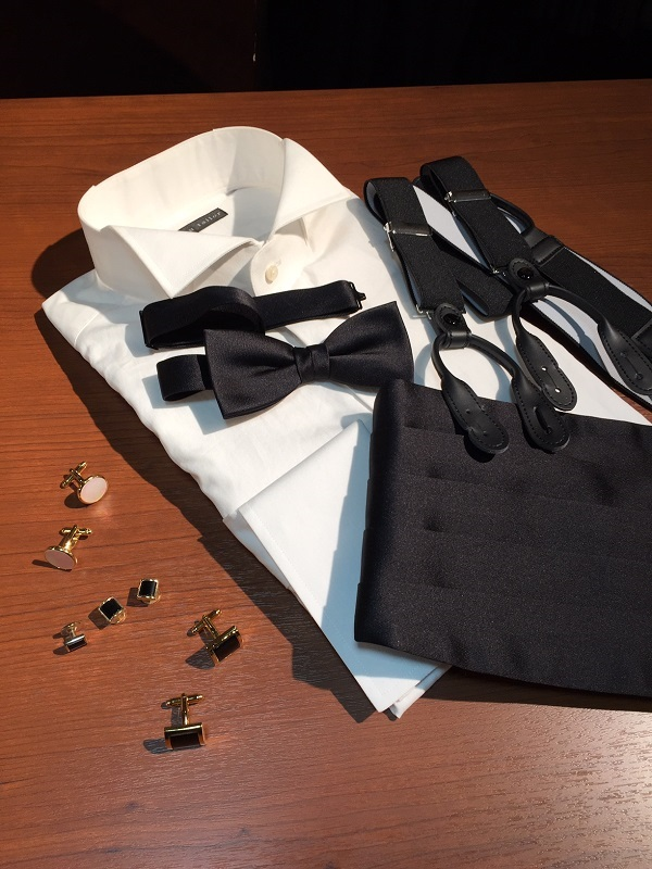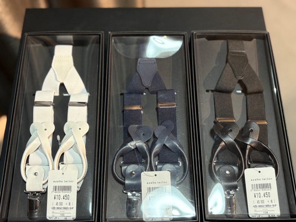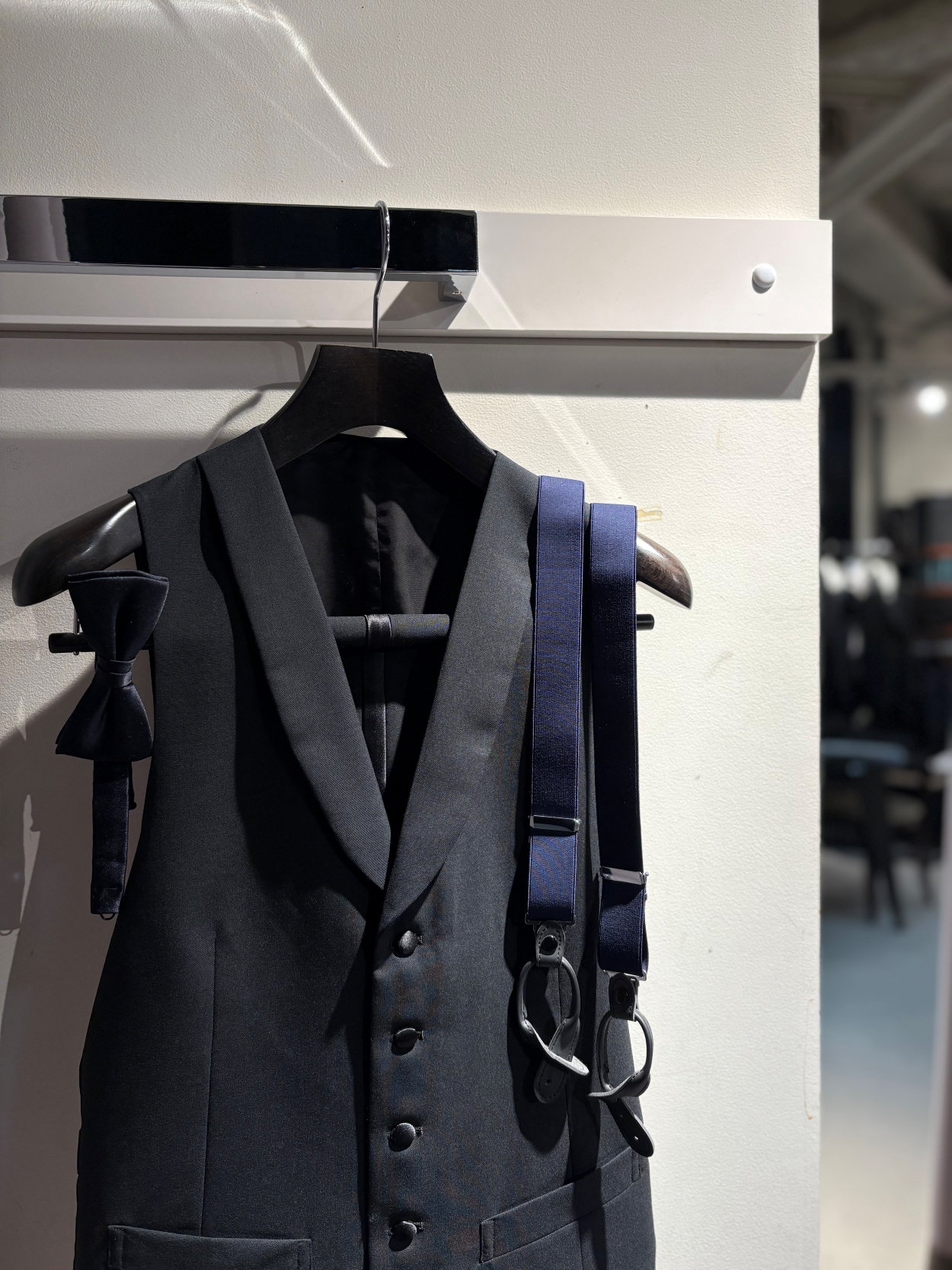 ベルトループのないパンツが王道のタキシードでは、サスペンダーで吊るすのが一般的です。無地から柄物まで取り揃えておりますのでぜひ店頭でご覧くださいませ。