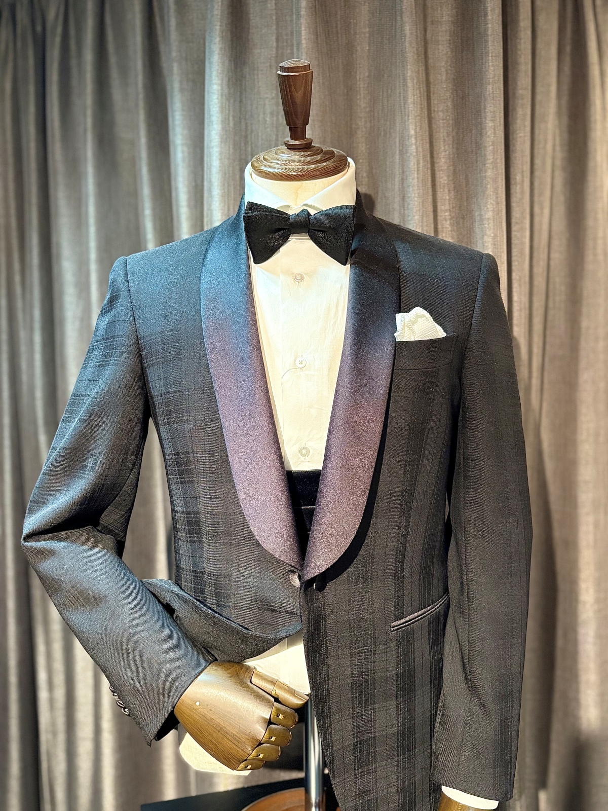 【ファンシータキシード】タキシードはブラックが定番カラーですが、写真のようなチェック柄やネイビー、グレーなどでお仕立てすることも可能です。 色彩や素材、デザインに多様性を持たせたものを”ファンシータキシード”と呼び、ブラックの無地に比べると柔らかい印象になります。