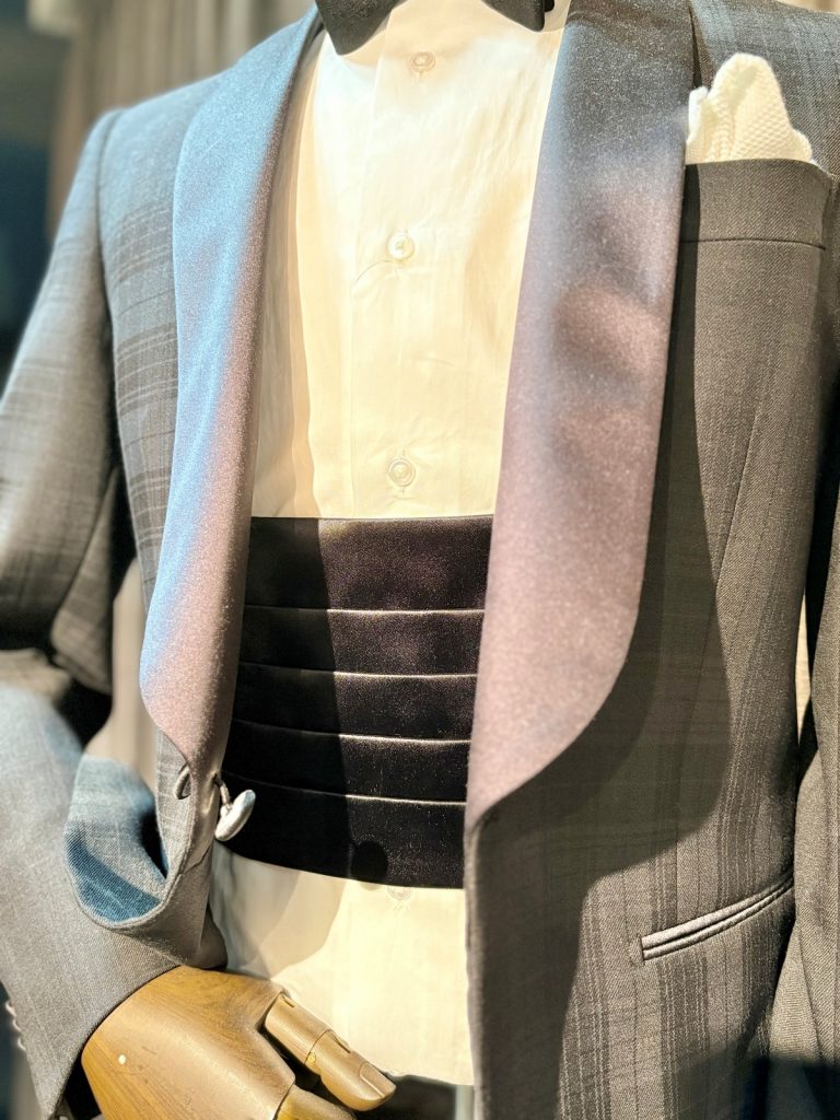 ジャケットの中はカマーバンドやベストを着用します。 スラックスはベルトレス仕様で、サスペンダーを付けるのが一般的です。スラックスにはジャケットの衿と同じ生地の側章が付きます。側章は縫い目を隠したり、格式を際立たせたりする役割をしています。