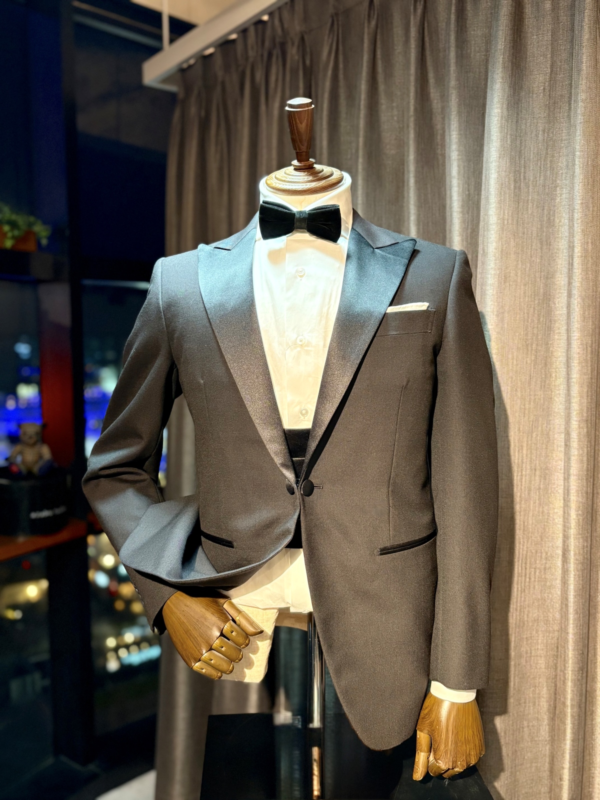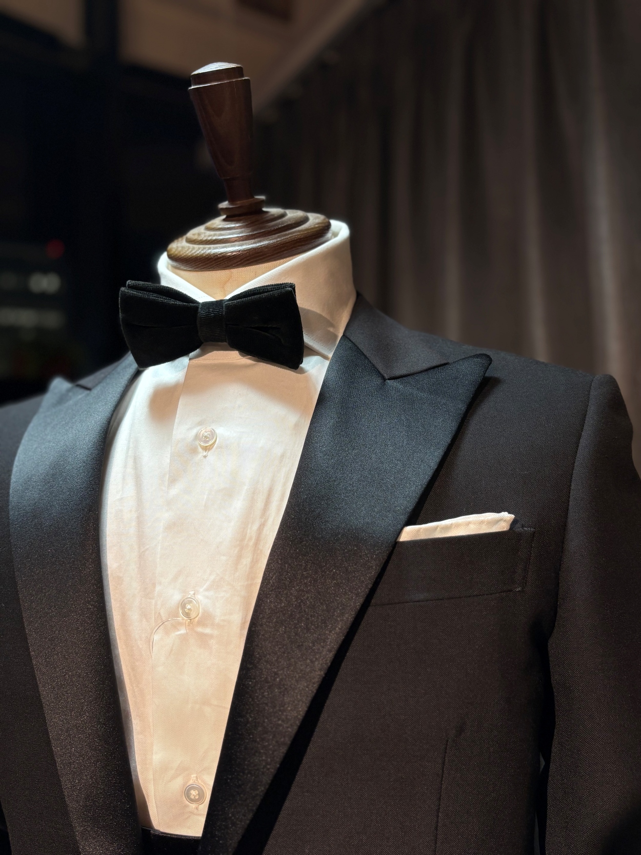 麻布テーラーでは通常のスーツの価格+¥16,500(税込)でタキシードをオーダーいただけます。 オーソドックスなタキシードは、拝絹(はいけん)と呼ばれる衿、フロント釦は1つ、ボディと同じ生地で包んだ拝み釦(おがみぼたん)が付きます。腰ポケットは蓋のないものが一般的で、衿の形はピークドラペルとショールカラーのどちらかをお選びいただけます。