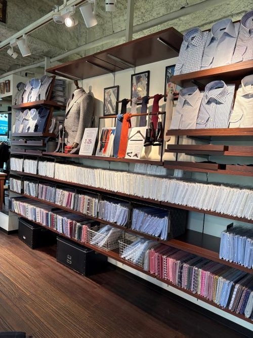 麻布テーラー全店共通のオーダースーツ・オーダーシャツ等などオーダービジネスウエアに加え、オーダーチノ等のカジュアルアイテムも幅広く取りそろえる名古屋エリア1号店(旗艦店)となります。