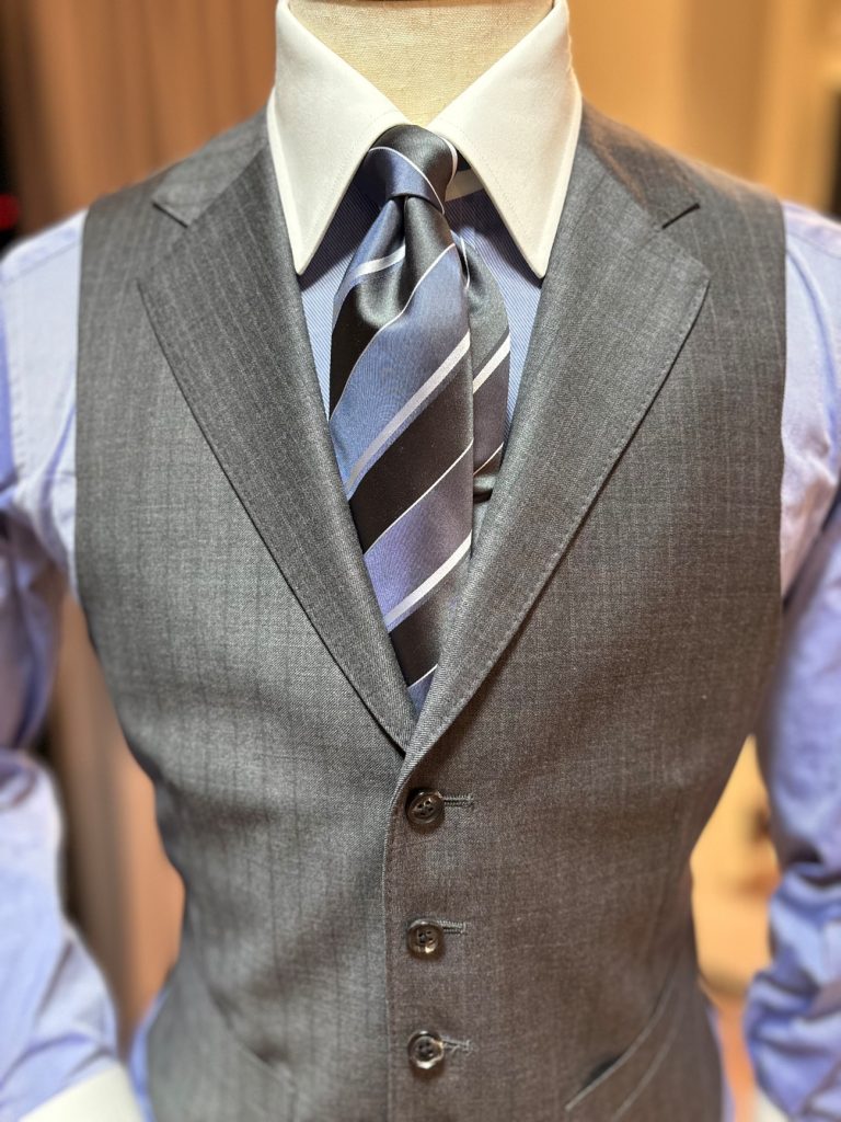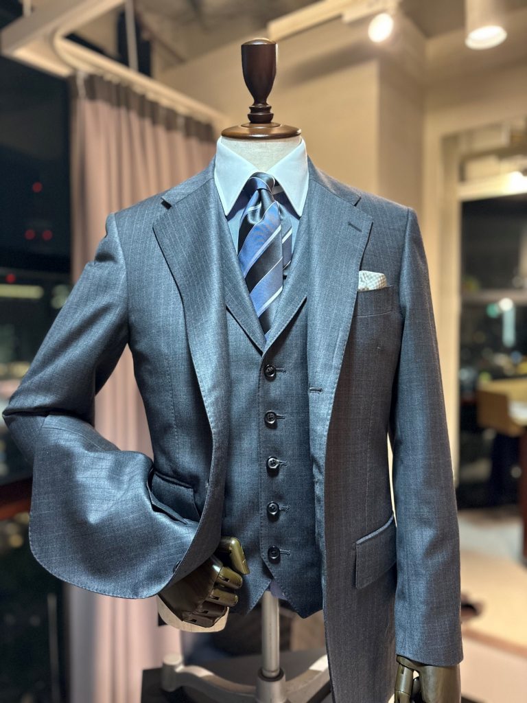かつてシャツがまだ下着として扱われており、それを隠すためにベストが着用されていたという19世紀。当時、スーツの発祥の国である英国では、ベストはウエストコートと呼ばれ、上着とパンツ、そしてベストがあって初めて正しいスーツの装いが完成しました。そんな出自もあいまって、現代でもベストを着用したスーツスタイルは、より正統できちんとした印象を与えます。