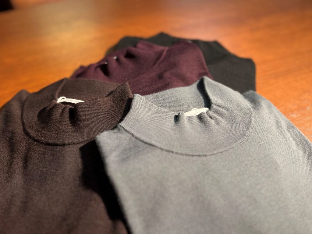 デザインは、ジャケットの中に着てもスマートに着こなせるサイズ感と、襟周りのデザインや編み方にも工夫を凝らしています。