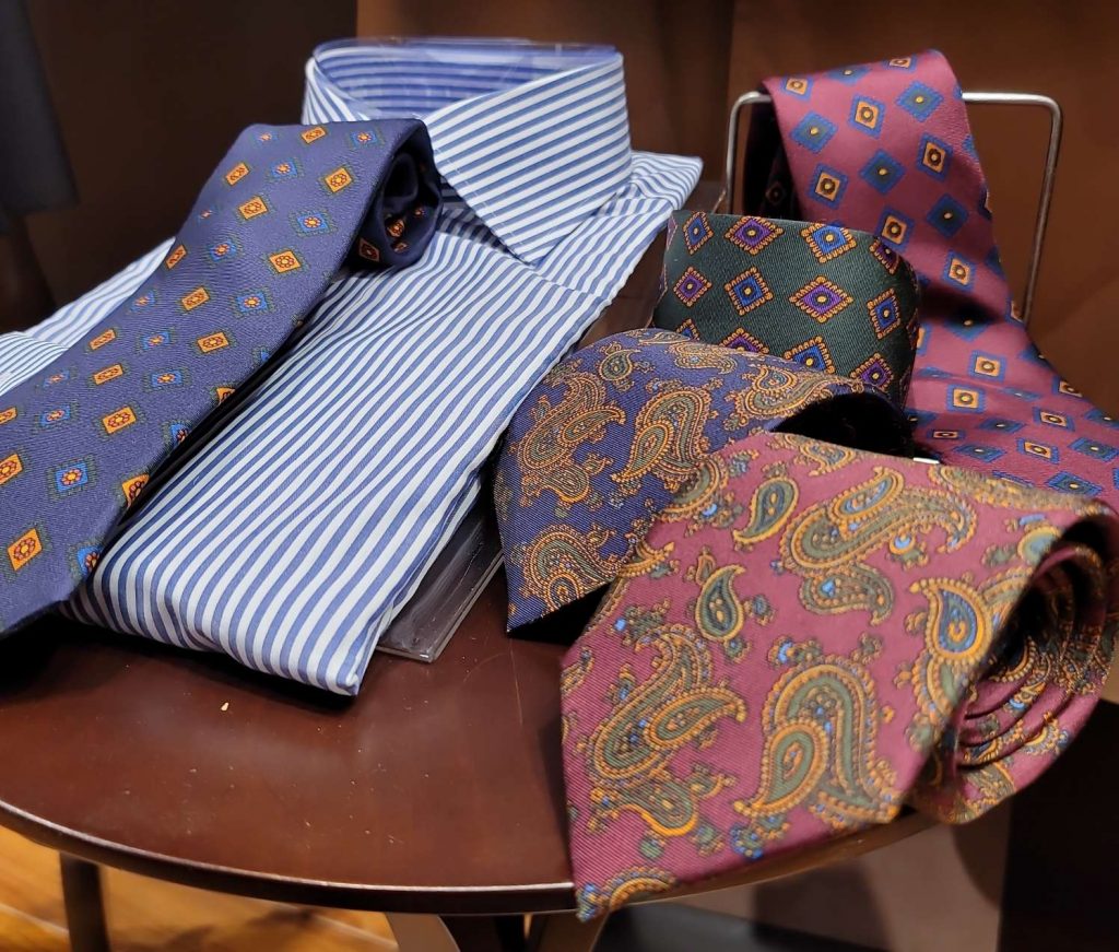 シルク特有の上品な光沢と英国らしい繊細でクラシカルな柄行が品格のあるVゾーンを演出します。