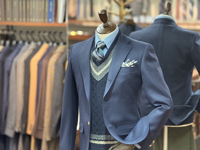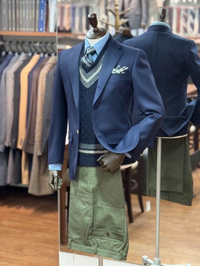 お店のトルソーたちも一足早く冬らしいコーディネートに様変わりしています。今季注目の「ブリティッシュアメリカン」テイストな2体。季節感漂うブラウンジャケットを主体としたコーディネートと王道のブレザーをプレッピーなムードに着こなすコーディネート。今回はブレザーの方にフォーカスしてご紹介します!